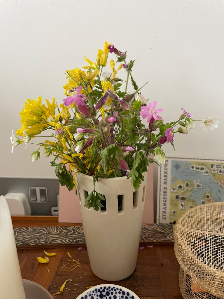 On my way there I’d still not decided what to bring as my offering to the Women’s Circle that evening, to represent love and beauty. I’d considered my purfume, cheek tint and a card from a friend, in the rush of getting ready. But it struck me on the way there, that it was right next to me the whole time. It was the hedge. The one I pass on my way to work, to various community groups, to the beach and on my way currently to this circle. They show the seasons. They’ve let me change. They provide themselves again and again. I stopped the car at the next passing point and cut some of the bracken and picked some of the flowers. I realised they were not as soft and delicate as they seemed from the drivers seat. I recieved some scabs on my wrists and stings on my arm during the process. They reminded me in that moment that love and beauty often comes with pain and scars and stinging, as much as they do with vibrance and excitement and journeys. It is real love when the travellers passing through can endure both the beautiful and the difficult.